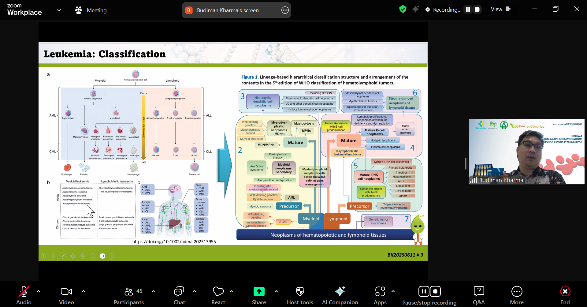 Pada materi kedua, dr. Bambang Ardianto, Ph.D, M.Sc, Sp.A (K)memaparkan strategi penanganan Leukemia anak berbasis genetik. Beliau menyoroti bahwa setiap pasien memiliki profil genetik unik, dan pemahaman terhadap translokasi gen menjadi dasar untuk terapi yang lebih efektif. Pendekatan ini tentunya sesuai dengan tujuan Ecosains Hayati dalam memperkenalkan Hemavision sebagai alat diagnostik yang mampu menjembatani penelitian genetik dan kebutuhan klinis.